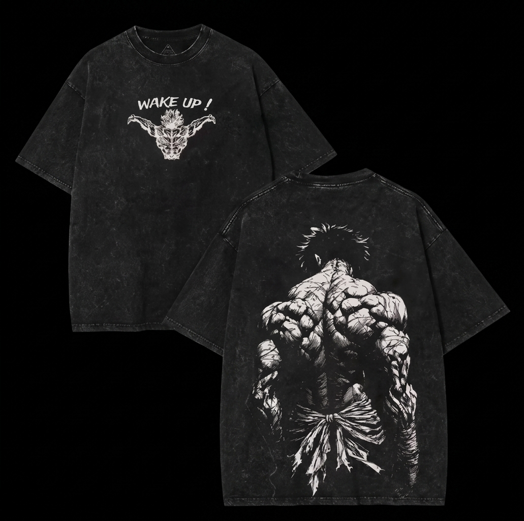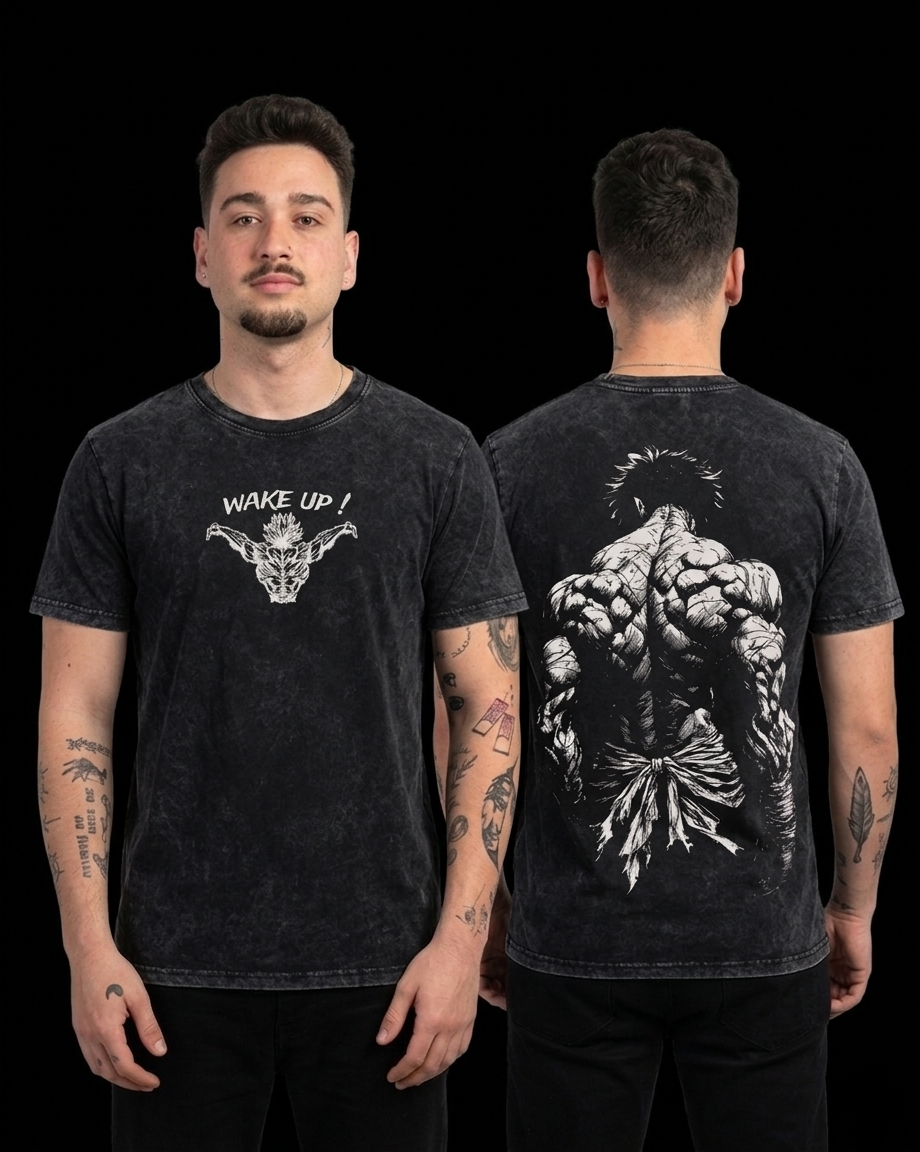Despierta tu mejor versión con esta camiseta negra de efecto lavado vintage que combina estética anime y energía pura. En el frontal, el mensaje “Wake Up!” junto a un diseño impactante marca el tono. En la espalda, una ilustración detallada de un cuerpo musculoso transmite fuerza, constancia y mentalidad de superación.